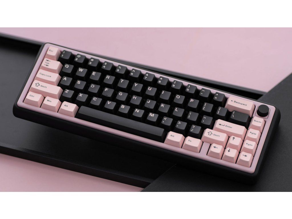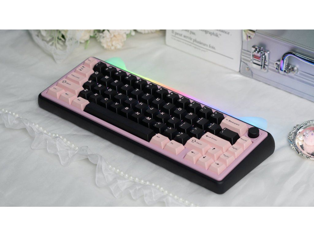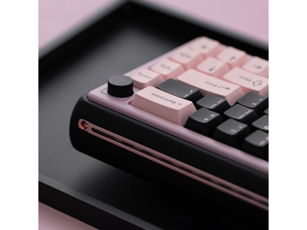 Chilkey Foxy65 – mechanické spínače Pink Lotus (lineární) nebo Sprout Green (taktilní), drátová/bezdrátová (Tri-mode), RGB podsvícení, kompaktní (65%) layout, americká lokalizace kláves, hliníková konstrukce, USB-C konektor. Barva Black Pink.